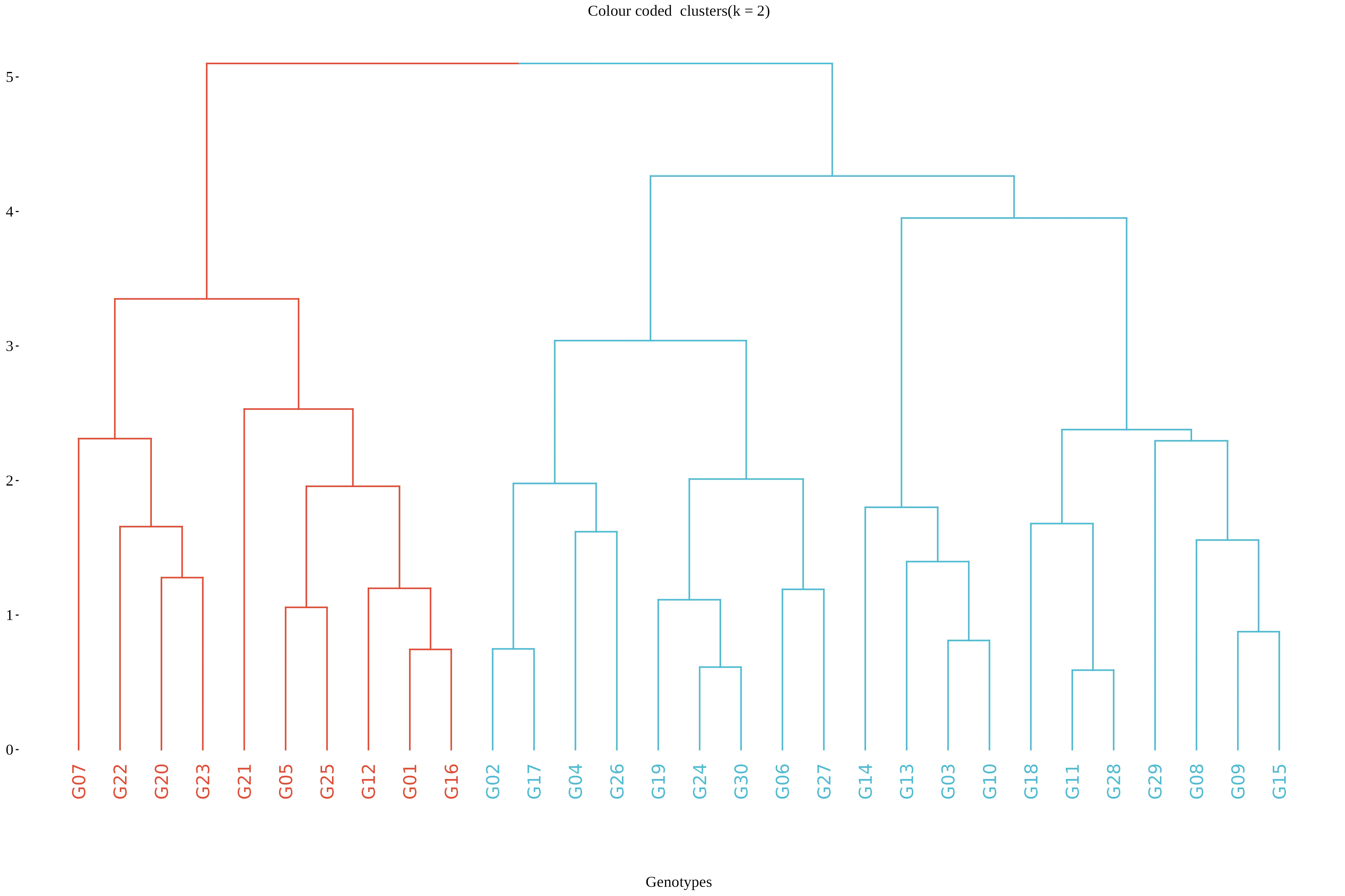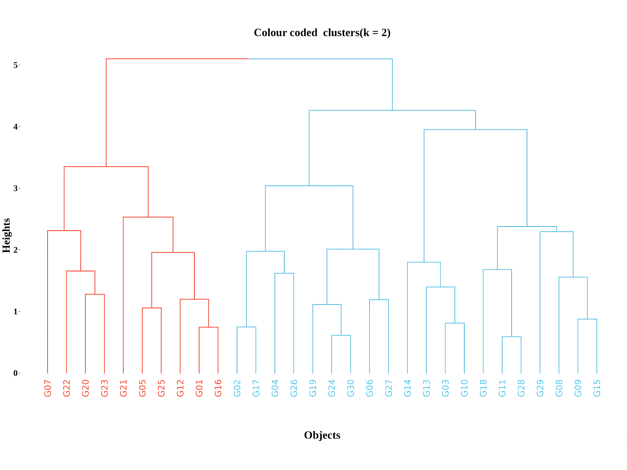 A coloured rectangular dendrogram is an enhanced dendrogram visualization where clusters are not only enclosed in rectangular boxes but these boxes and the associated branches are also color-coded to clearly distinguish different clusters. This combination improves interpretability and presentation of hierarchical clustering. results.