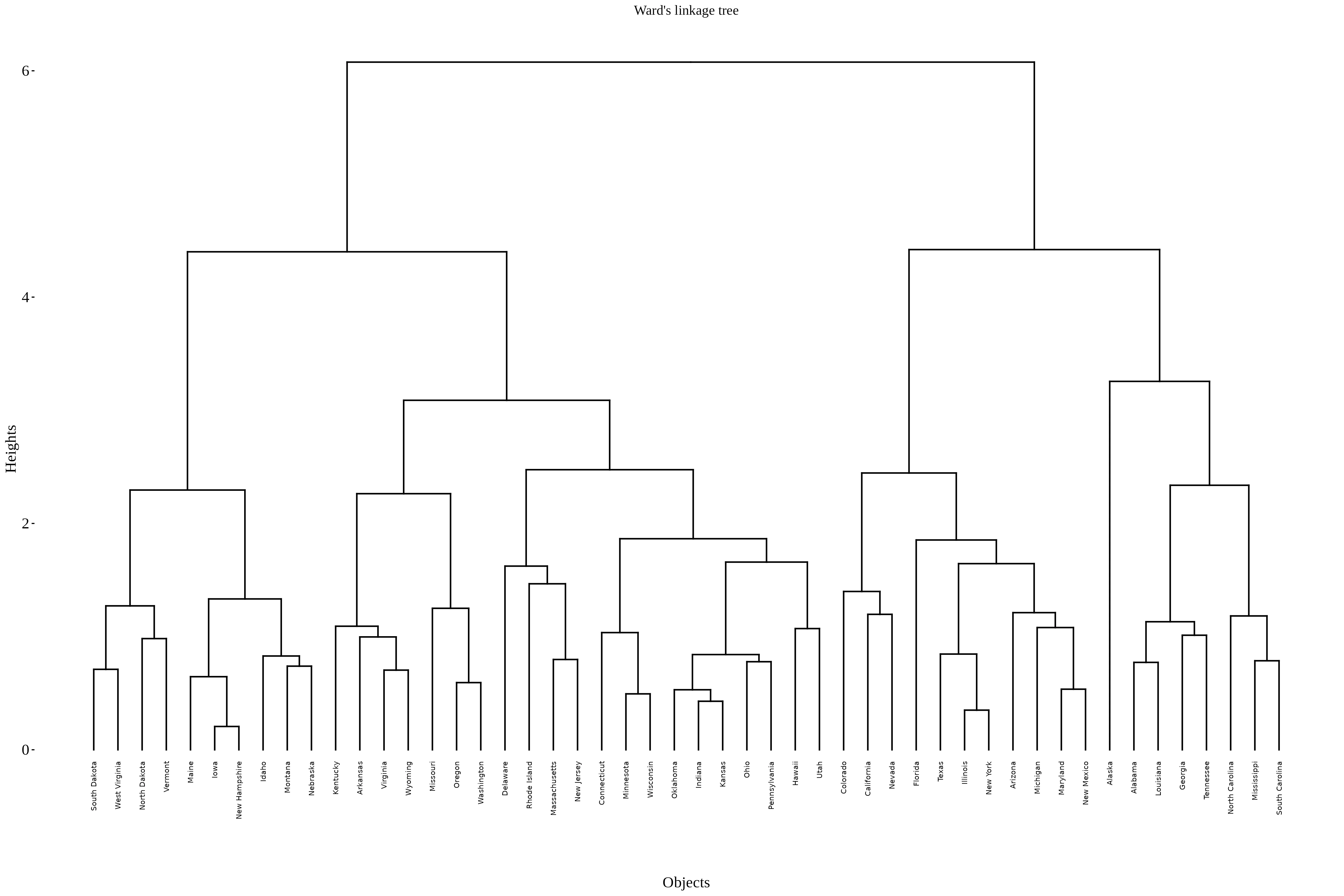 Ward’s linkage merges clusters such that the increase in total within-cluster variance is minimized. It uses a variance-minimizing criterion based on squared Euclidean distances and tends to produce compact, spherical clusters. Ward.D2 specifically refers to Ward’s method with squared distances, popular for its stable and interpretable clusters.