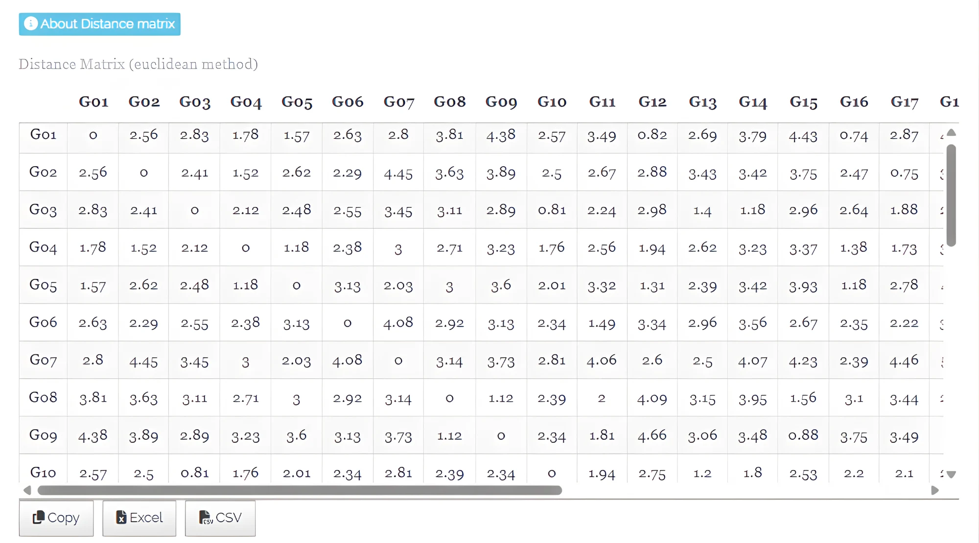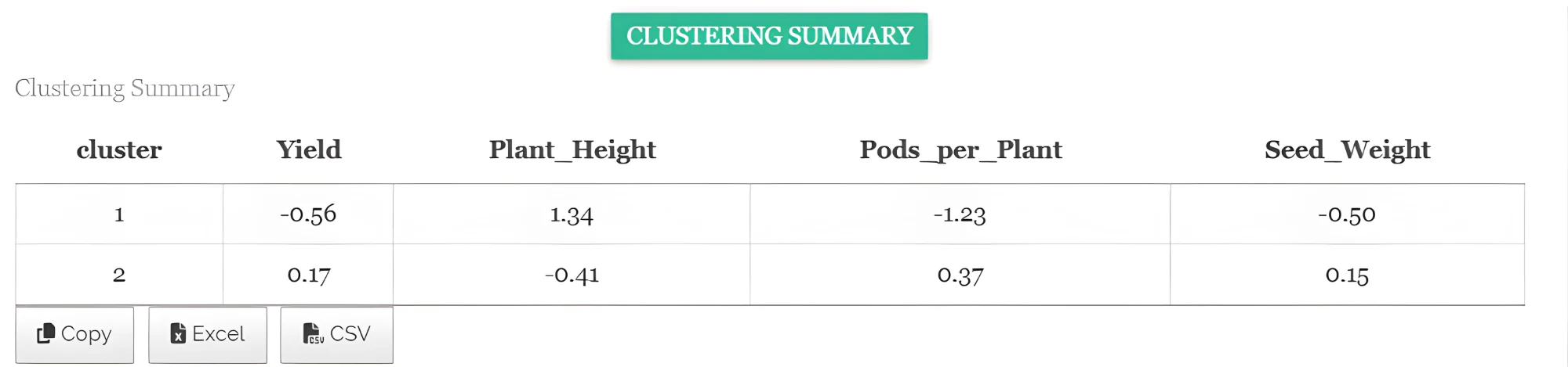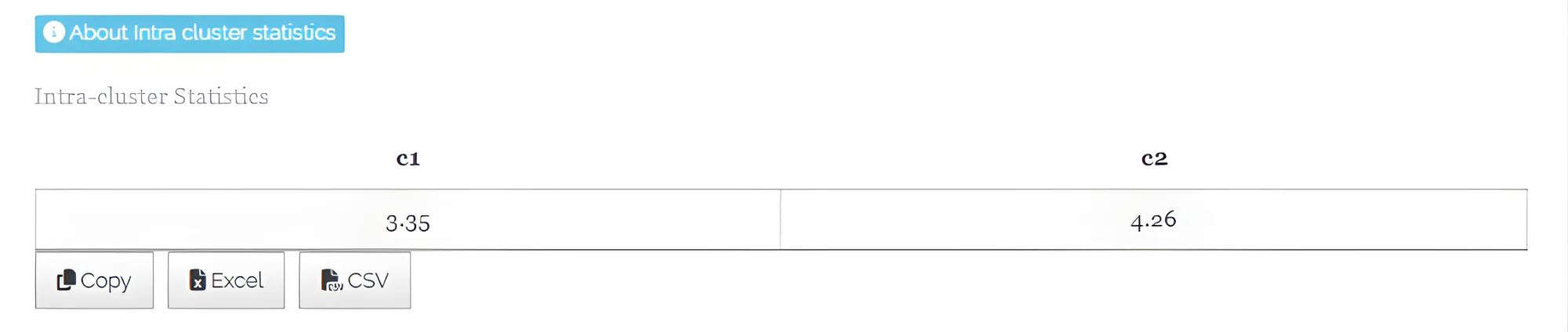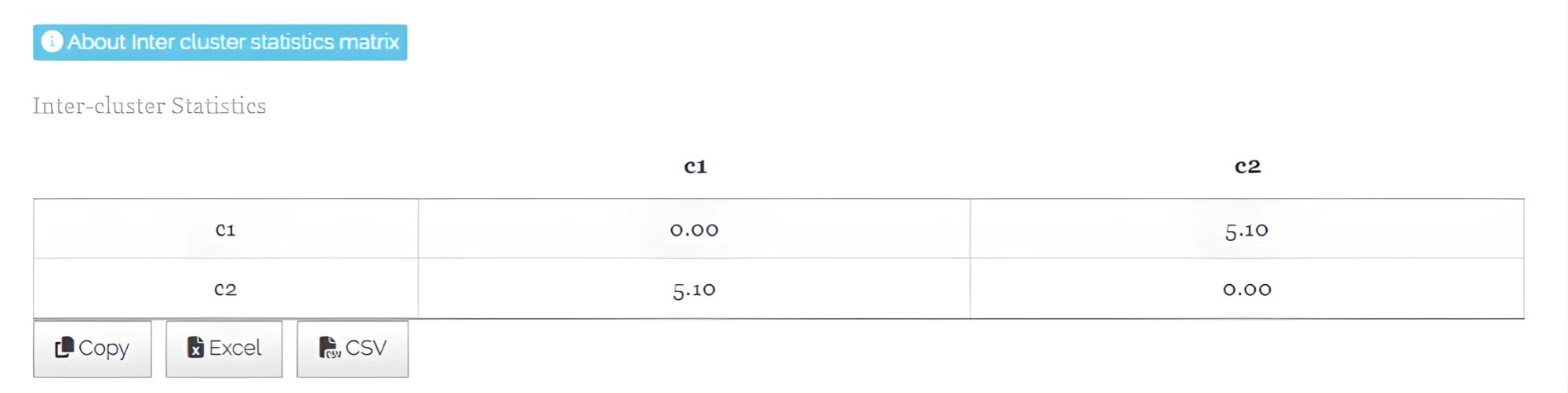In Metrics (See Figure 21) tab you can see the Distance matrix, Cluster-wise means, Intra-cluster Statistics and Inter-cluster Statistics tables and you can either copy this file or download these tables in .xlsx or .csv formats for use in reports or presentations.