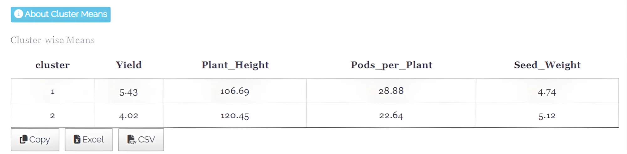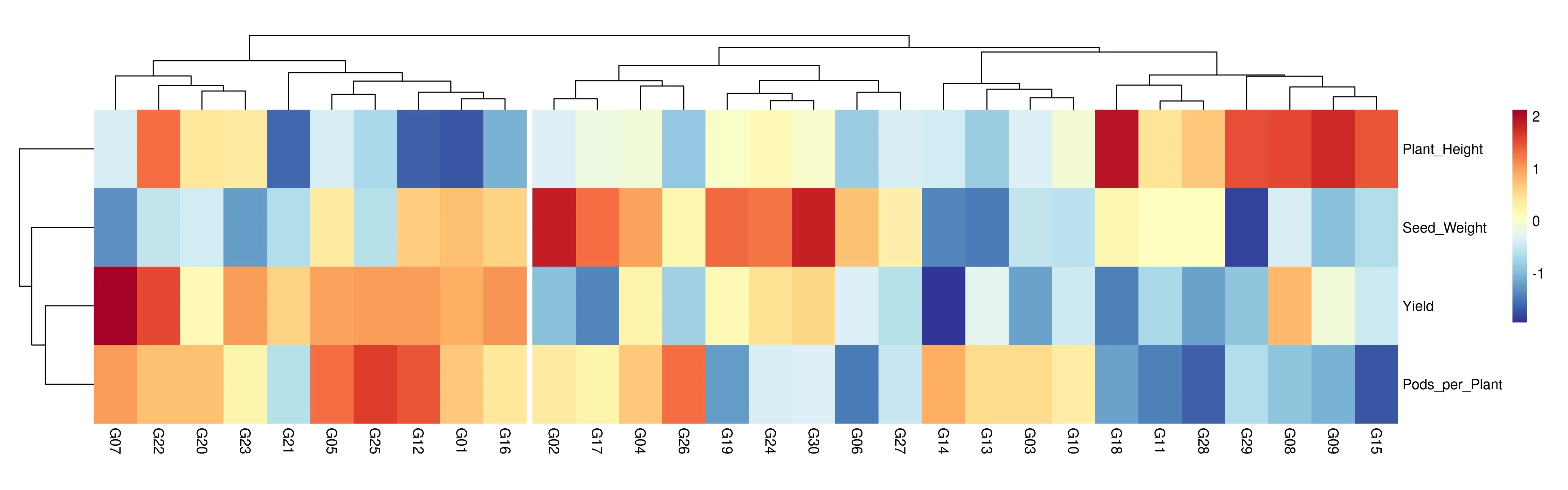 We will explain hierarchical cluster analysis (HCA) using an example. Let’s consider a dataset with 30 genotypes and four variables - Yield, Plant_Height, Pods_per_Plant, and Seed_Weight. Our aim is to perform cluster analysis to group the genotypes based on these characters.