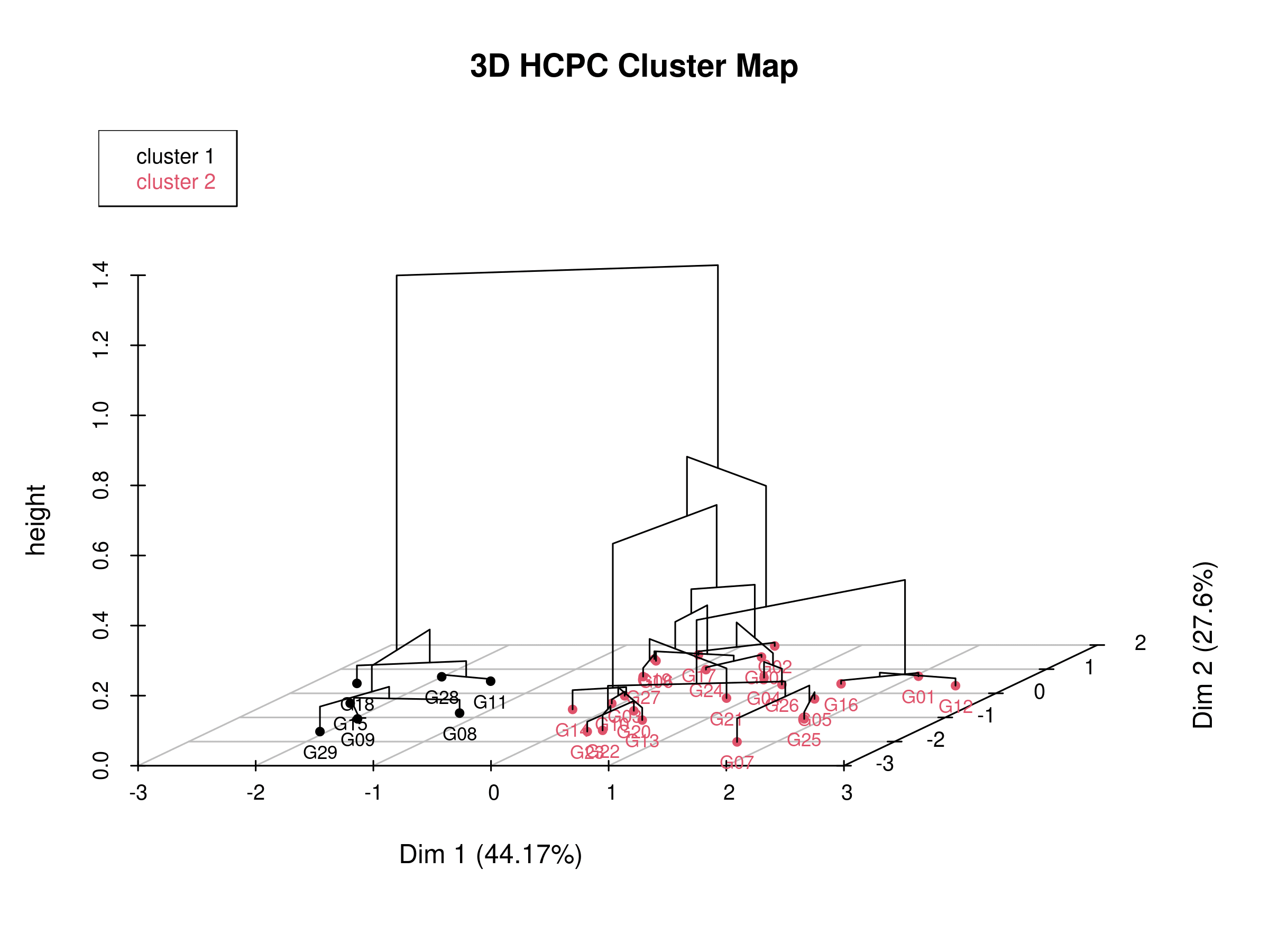 In Figure 31, the three-dimensional hierarchical clustering plot projected onto the PCA factor map visually integrates both the dimensional reduction from Principal Component Analysis (PCA) and the grouping structure from Hierarchical Clustering on Principal Components (HCPC). The horizontal plane represents the first two principal components (Dim 1 and Dim 2), which together capture the largest proportion of variance in the dataset, while the vertical axis (“height”) indicates the dissimilarity or distance at which observations or clusters are merged. Each line segment shows how closely related individuals (such as genotypes or samples) are in the multivariate space; shorter vertical distances signify stronger similarity. The clusters, represented by colored labels, highlight groups of observations that share common patterns along the principal component dimensions. This 3D representation allows you to observe not only how clusters are hierarchically formed but also how they are spatially positioned and separated in the PCA space, providing a comprehensive view of both the clustering process and the underlying data structure derived from the principal components.