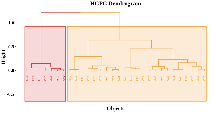 In Figure 30, the hierarchical dendrogram obtained through Hierarchical Clustering on Principal Components (HCPC) provides a visual representation of how observations are grouped based on their similarity in the principal component space. The vertical branches depict the progressive merging of individuals or groups, where shorter branches indicate closer similarity and longer branches represent greater dissimilarity between clusters. The height of each merge on the y-axis corresponds to the distance or dissimilarity at which clusters combine, allowing you to assess how distinct each group is. The colored rectangles highlight the main clusters identified by the analysis, where observations within the same color share similar multivariate characteristics derived from PCA. By examining the branching pattern and the height at which groups join, you can interpret the overall structure and relationships among the observations—how closely related they are, which clusters are more homogeneous, and where clear separations exist. This dendrogram thus serves as a hierarchical map of similarity, illustrating the underlying grouping patterns in your dataset as summarized by the principal components.