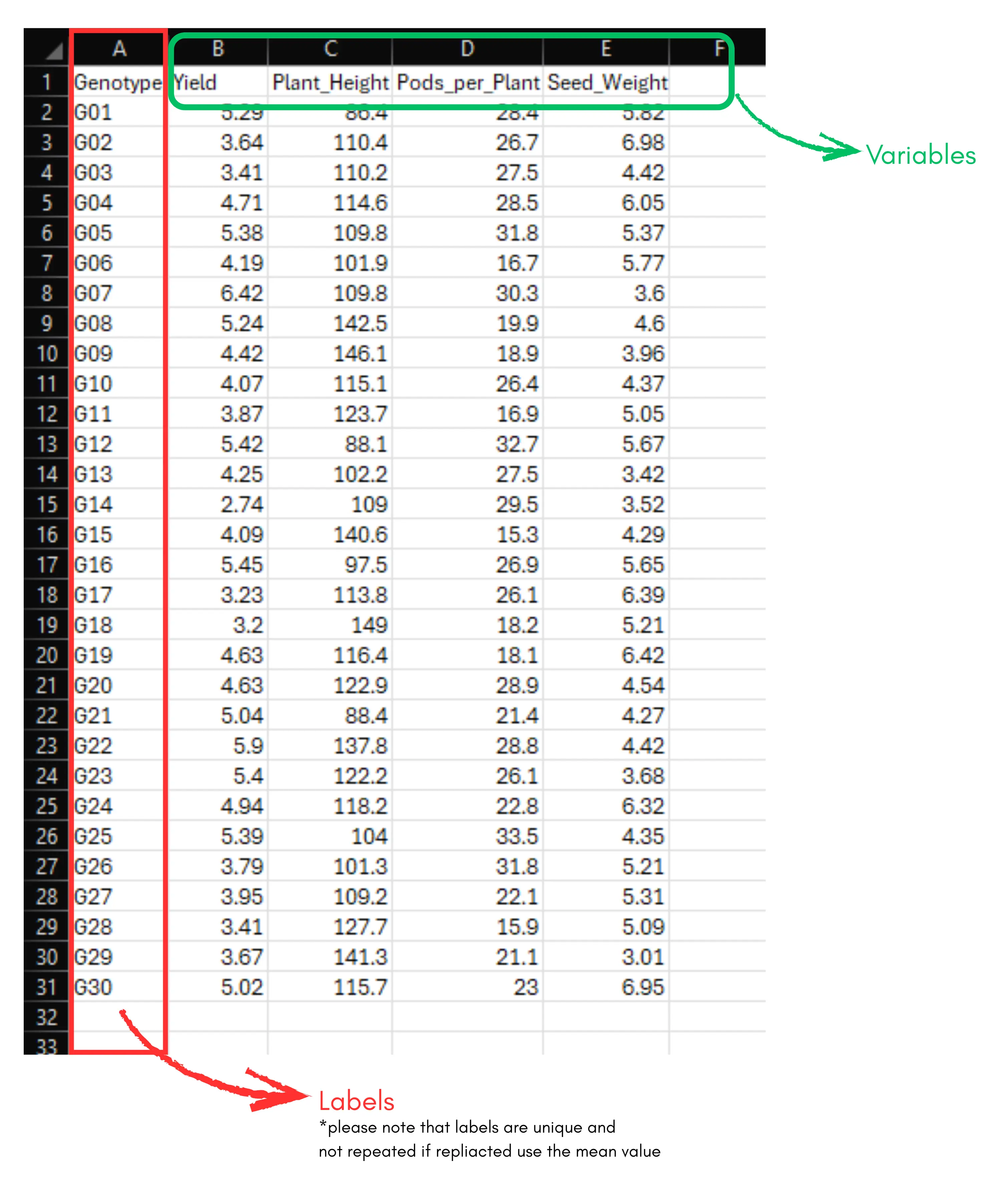 Two terms that we will use frequently are Labels and Variables. In our example, the Labels refer to the genotypes, and the Variables are the four traits mentioned earlier - Yield, Plant_Height, Pods_per_Plant, and Seed_Weight.