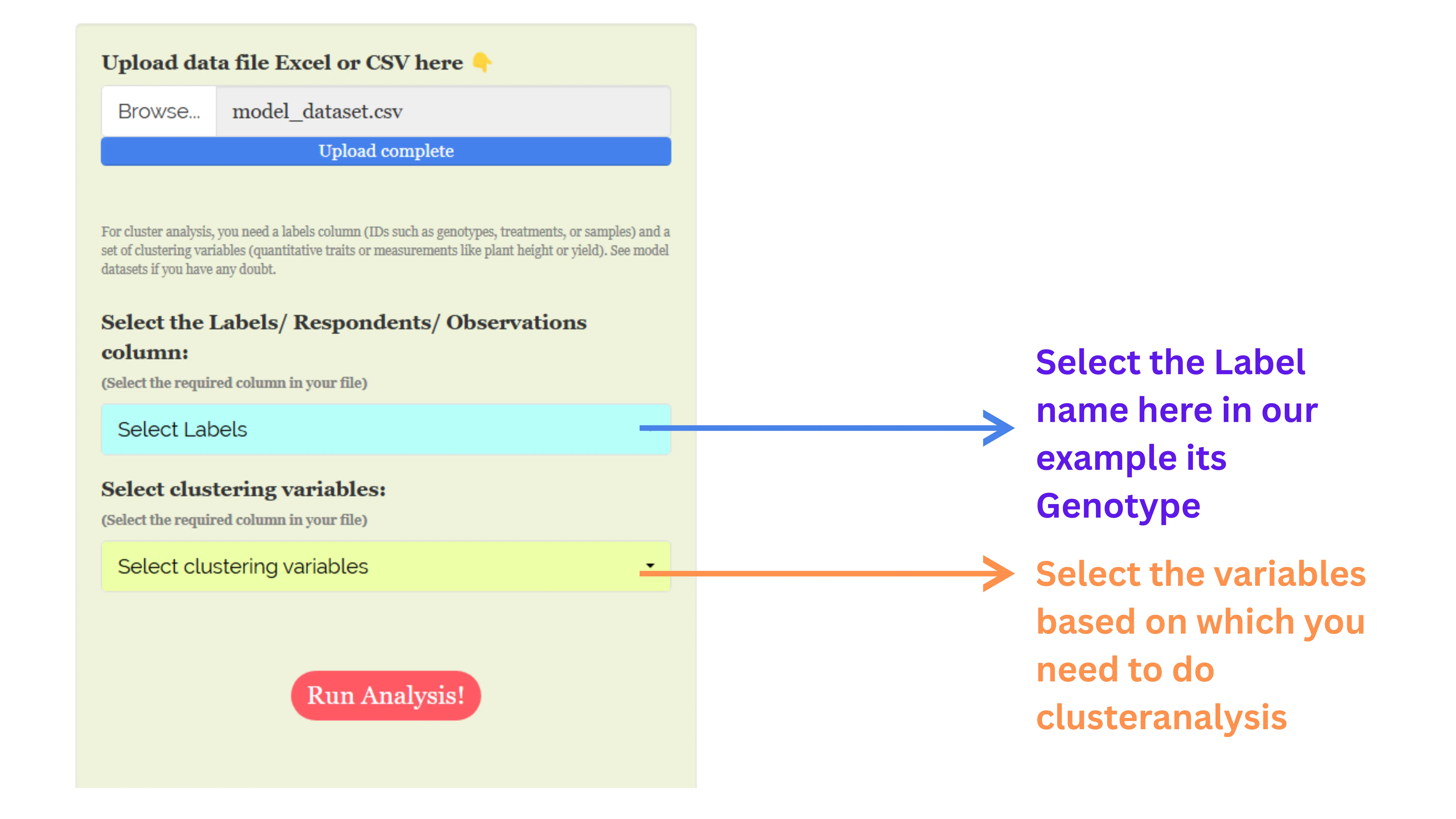 When the file is uploaded, options to select the variables and labels appear. Select appropriate column under Labels and variables, see Figure 5